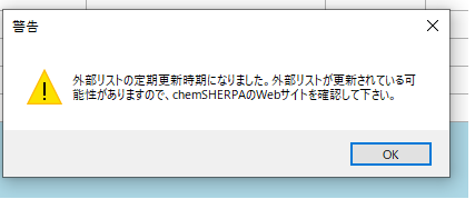 chemSHERPAの作成支援ツールは、公開後6ヶ月を超えると、ツールの起動時に更新の警告メッセージが表示されますが、公開後1年後までは起動できます。